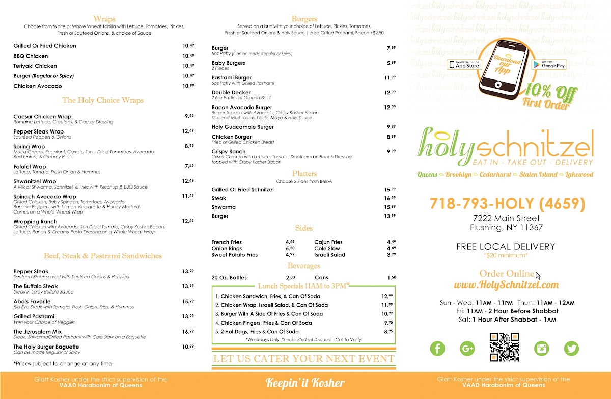Welcome to Holy Schnitzel (Queens) Menu, where crispy, golden schnitzels take center stage. Located at 7222 Main St, Queens, NY, this place is a haven for schnitzel lovers, offering a variety of mouthwatering options. Whether you're craving classic chicken schnitzel or looking to try something with a unique twist, there's a perfect dish waiting for you.